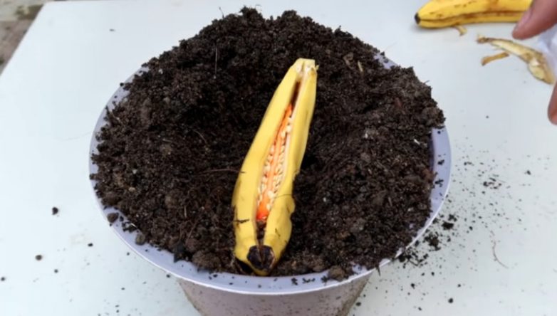 Подготовленные таким образом бананы поместите в горшки с питательным субстратом и слегка присыпьте землей. Сами бананы будут выступать в качестве удобрения и передадут семенам много питательных веществ.