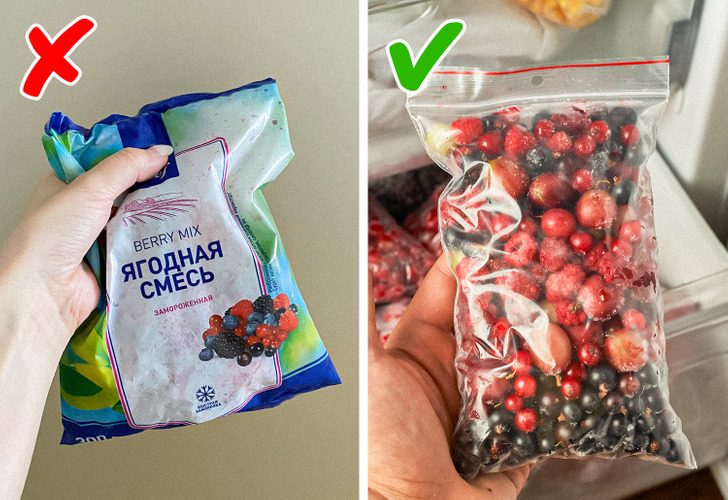 Если есть возможность и выбор, лучше покупать замороженные ягоды и овощи в прозрачных пакетах, чтобы видеть, как обстоят дела внутри. Однако чаще всего эти продукты продаются в непрозрачных упаковках и содержимое увидеть невозможно. В таких случаях стоит щупать упаковку. Если внутри встречаются слипшиеся комки, очевидно, что при хранении содержимое растаяло и было повторно заморожено.