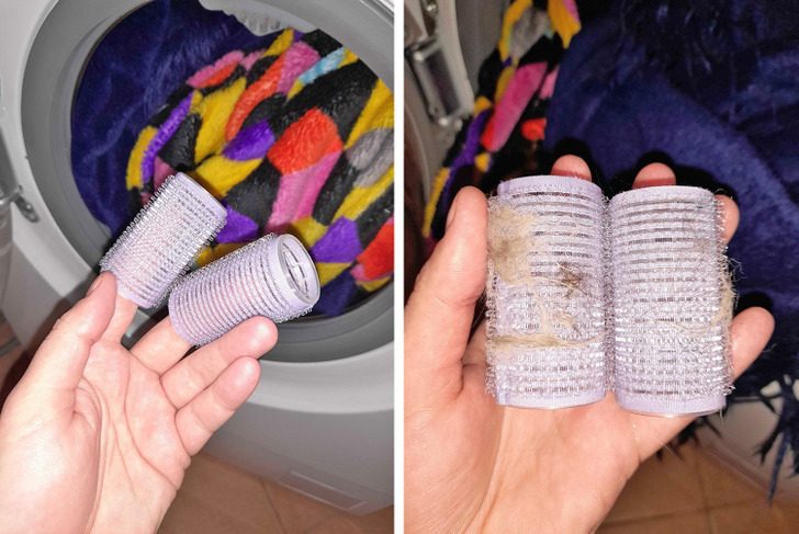 Владельцы животных не понаслышке знают, как сложно убрать с ворсистых тканей собачью шерсть, особенно короткую: она впивается в волокна, словно иголки. На просторах интернета советуют класть в машинку специальные «ловушки» для шерсти, но есть и более действенный способ — просто положить в машинку обычные бигуди-липучки.