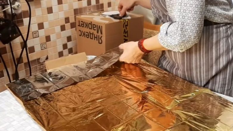 Коробку разберите. Внутрь приклейте на двусторонний скотч фольгу.