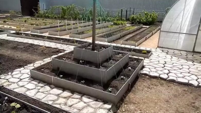 Грядка оформлена в виде пирамиды. Для самой грядки использовался плоский шифер. Нижний ярус — 180 см, средний — 120 см, верхний — 60 см.
