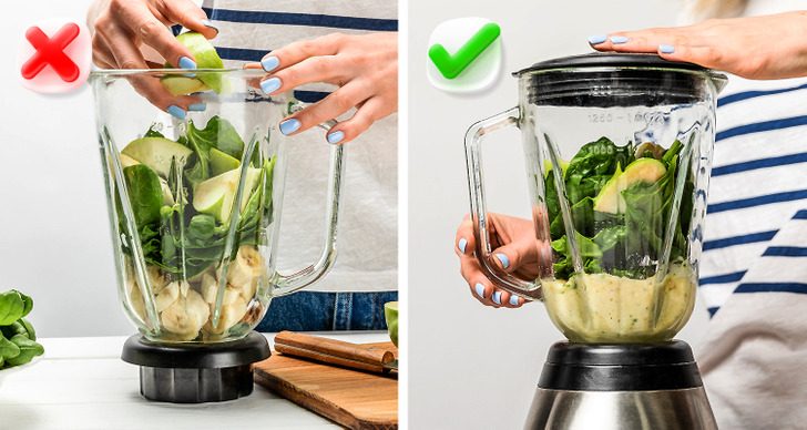 Чтобы блендер лучше справлялся со своими функциями, а не начинал сразу забрызгивать всю кухню, стоит соблюдать очередность его загрузки. Мы привыкли заливать ягоды молоком сверху. На деле стоит сначала налить в чашу жидкость, а уже потом закидывать твердые продукты.