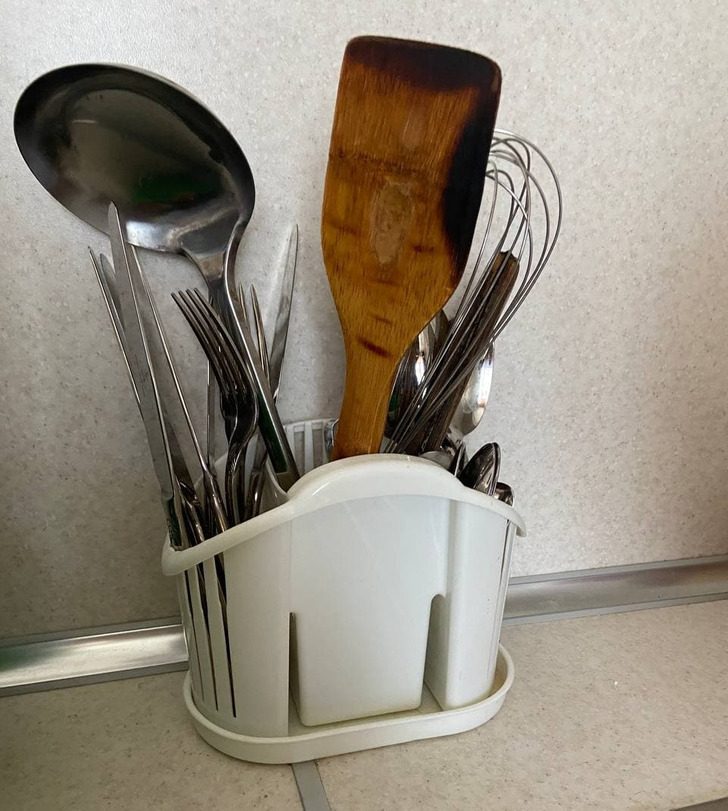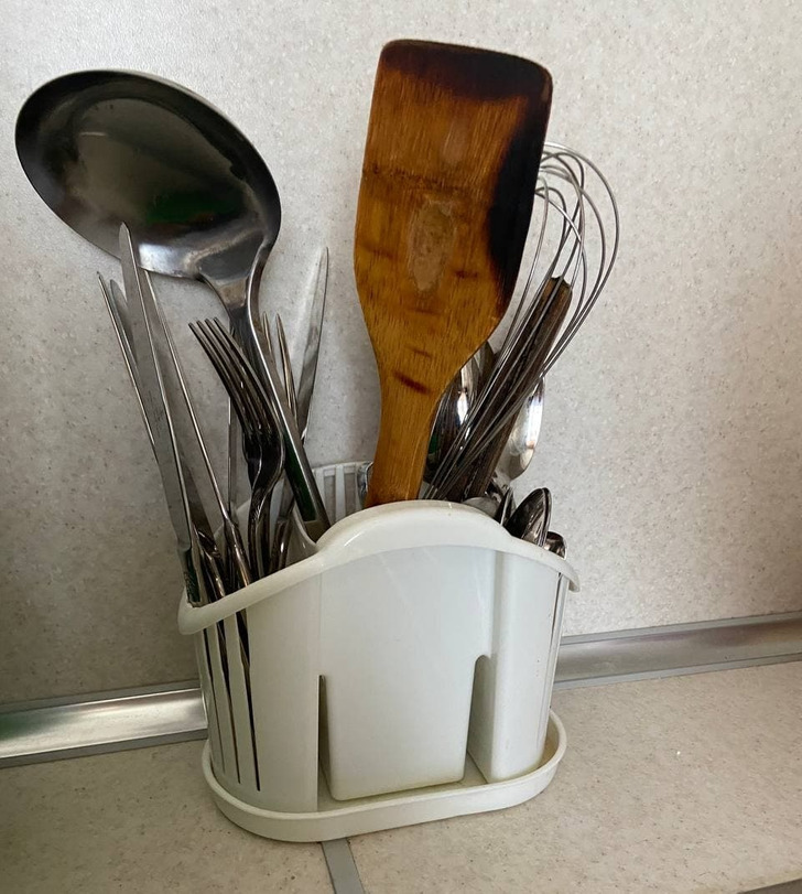 Изначально замысел у такой подставки был просто отличный: со столовых приборов, находящихся в вертикальном положении, стекала вода. После просушки их достаточно было сразу убрать в шкаф. Но на практике нередко в подставке заводится плесень, а не протертые приборы покрываются налетом. Так что хотя приспособление и удобное, но внутри него сплошные микробы.