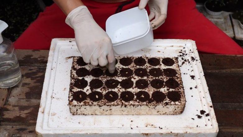 Замочите семена огурцов в тёплой воде на пару часов, затем высадите во влажный кокосовый субстрат. Дождитесь прорастания.
