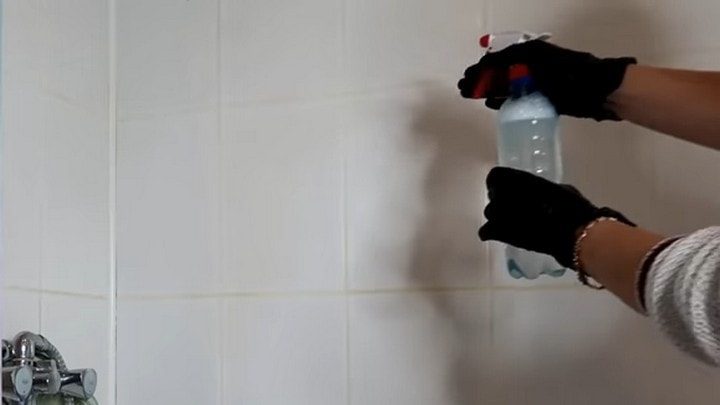 Работая с «Белизной» не забудьте защитить руки, а поскольку жидкость будет разбрызгиваться, то не лишним будет защитить и органы дыхания. Итак, обильно нанесите раствор на плитку, швы и места, где появилась плесень.