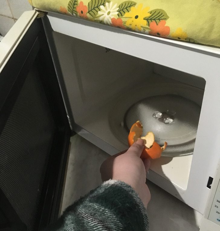 Иногда мы открываем дверцу микроволновки, и у нас пропадает всякое желание разогревать там еду. Вместо этого хочется зажать руками нос и отойти на безопасное расстояние, так как внутри печи поселился неприятный запах. Избавиться от проблемы довольно просто. Нужно взять кожуру мандарина и немного прогреть ее на небольшой мощности, чтобы не допустить пригорания. Дурной запах исчезнет. Таким же образом можно заставить благоухать духовой шкаф.