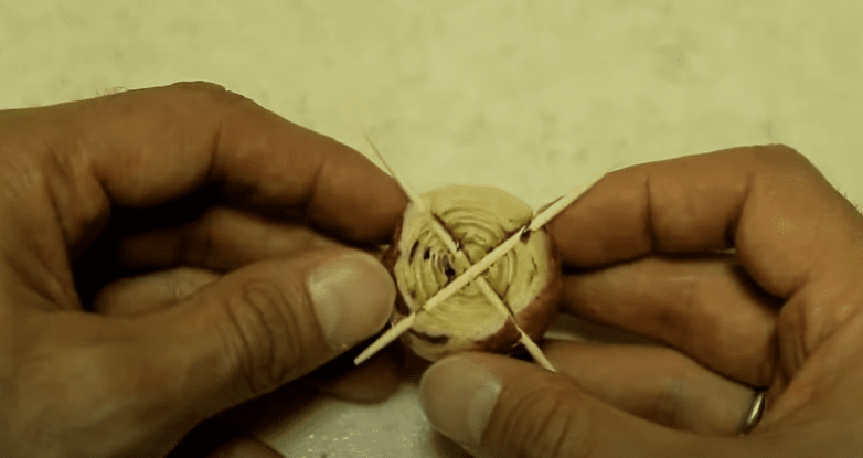 Далее делаем на верхней, обрезанной части луковицы крестообразные надрезы на глубину примерно 1/3 от высоты оставшейся луковицы. В которые затем вставляем зубочистки.