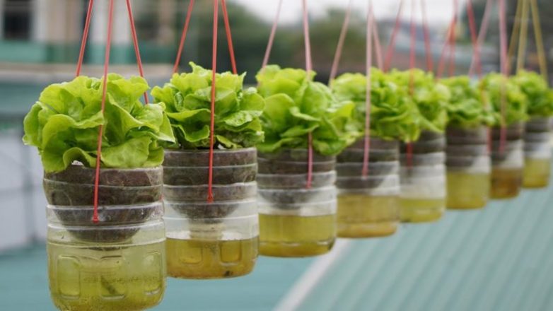 Насыпьте в бутылку грунт, увлажните. Высадите черенки салата. Подвесьте конструкцию на солнечном месте. Больше от вас ничего не требуется! Поливается он сам, набирая столько воды, сколько нужно, через ткань.