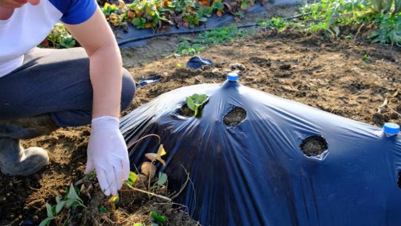 Сверху укрыть грядку чёрной плёнкой (укрывной материал). По краям присыпать землей и притоптать, чтобы плёнка не сдвинулась. Там, где торчат крышки бутылок, сделать надрезы, чтобы можно было заливать воду прямо в прикопанную бутылку, не доставая её.