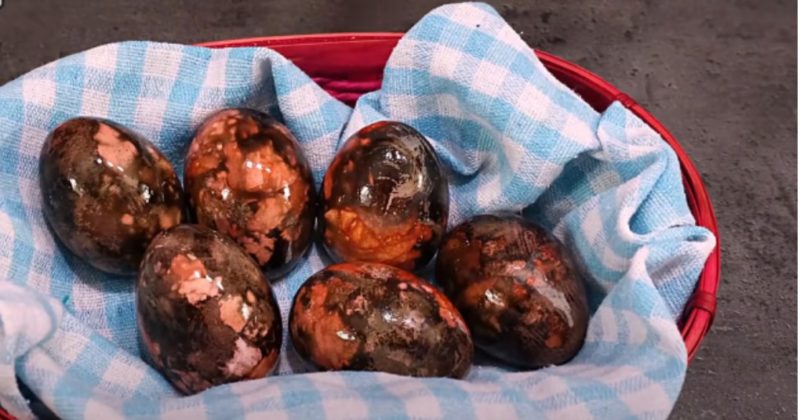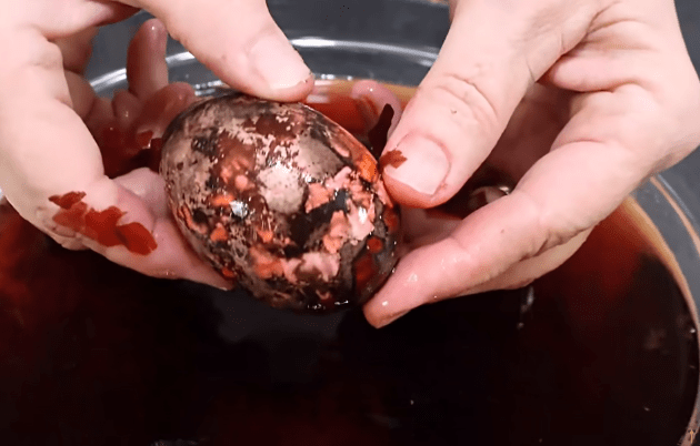 Теперь ставим кастрюлю на огонь и варим в течение примерно 10 минут, затем оставляем яйца в красящем растворе еще примерно на 40 минут. После чего снимаем с них все лишнее.