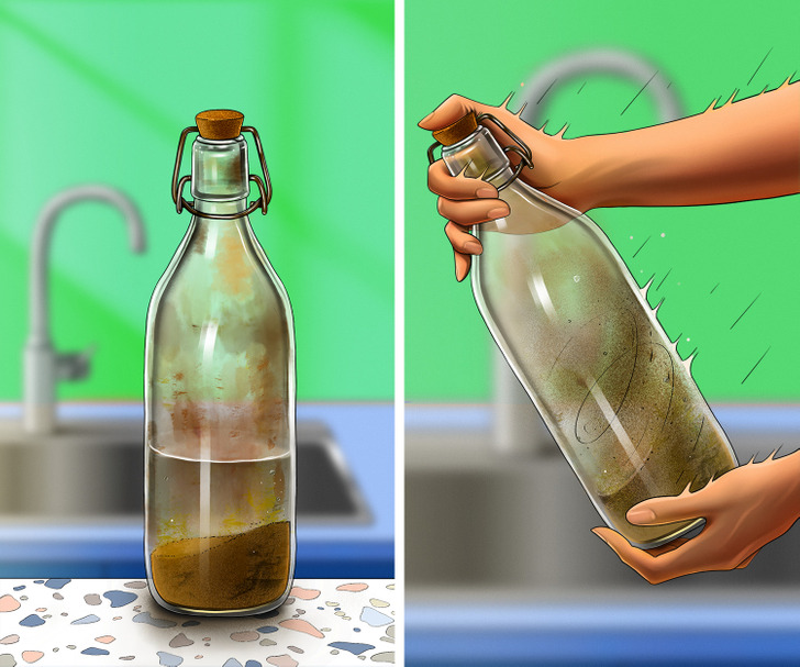 Чтобы очистить бутылки с узким горлышком изнутри, можно засыпать внутрь немного песка, залить его водой и взболтать.