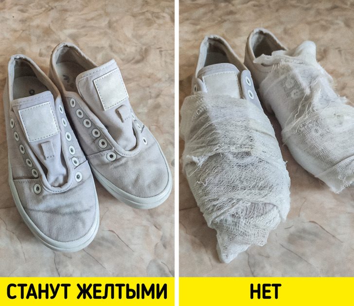 Стоит летом один раз проехаться в автобусе в час пик, как кеды или тенниски отправляются в стирку — кто-нибудь обязательно наступит на ногу. Вероятно, вы, как и автор данной статьи, сталкивались с тем, что, высохнув, кеды покрываются желтыми разводами: так клей выходит на поверхность ткани. Перестираешь — эффект тот же. Но есть маленький секрет: после стирки (вода должна быть холодная) оставьте кеды сушиться, плотно обмотав их марлей или бинтом. В результате весь клей просачивается через марлю и остается на ней. А поверхность кед остается идеально белой.