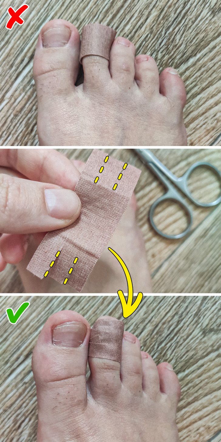 Чтобы защитить травмированный палец на ноге или предотвратить появление мозолей, нужно носить пластырь. Но лучше его клеить строго определенным образом — так он будет держаться крепче и не топорщиться. Сперва пластырь следует надрезать по краям несколько раз. После чего, обернув им палец, каждый надрез с противоположной стороны приклеить поочередно: верхний справа / верхний слева, средний справа / средний слева и т. д.