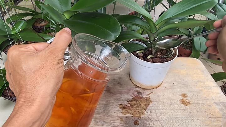 На следующие сутки подкормите орхидею, дав на одно растение 3-4 ч. л. лукового настоя.