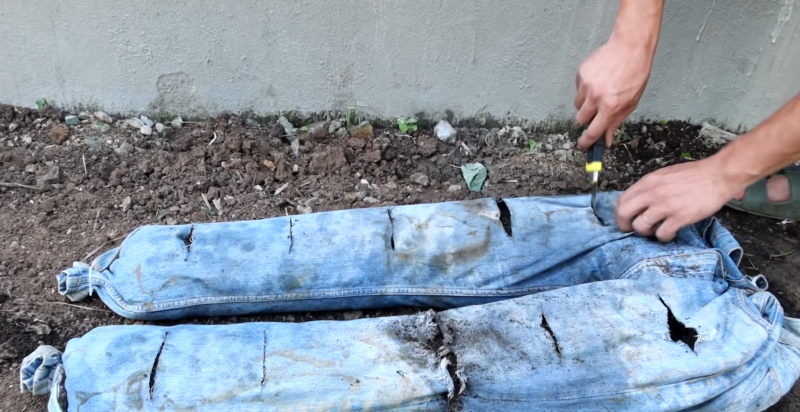Наполните старые джинсы землей. Закрепите нижнюю часть штанин и пояс кабельными стяжками. Сделайте на джинсах разрезы острым канцелярским ножом.
