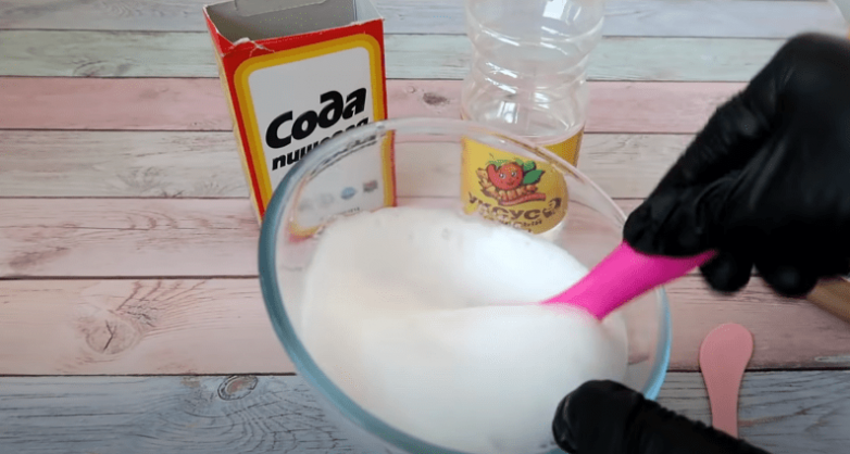 К 3 ст. л. пищевой соды добавляем 3 ст. л. жидкого хозяйственного мыла или средства для мытья посуды, перемешиваем, а затем добавляем к ним 2 ст. л. уксуса, перемешиваем. Однако если вам не нравится и малейший запах уксуса, добавьте в смесь несколько капель любого эфирного масла.