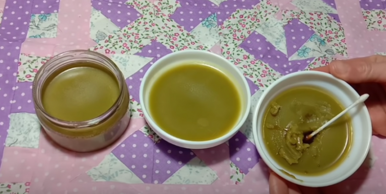 Дав траве потомиться, хорошо процеживаем ее через марлю, отжимаем, чтобы получить чистый отвар. После чего в еще не остывший отвар добавляем пчелиный воск, на 1 стакан жидкости примерно 20-30 г воска.