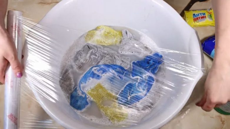 Таз с тёплой водой и носками полностью закройте пищевой плёнкой. Будет поддерживаться нужная температура, а также создастся эффект бани. Грязь сильнее размягчится, и носки лучше отстираются. Оставьте в таком виде на час.