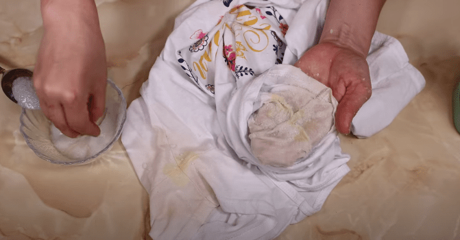 Когда соль полностью растворится, опускаем в воду проблемное место и оставляем примерно на 30 мин, после чего стираем подходящих образом.
