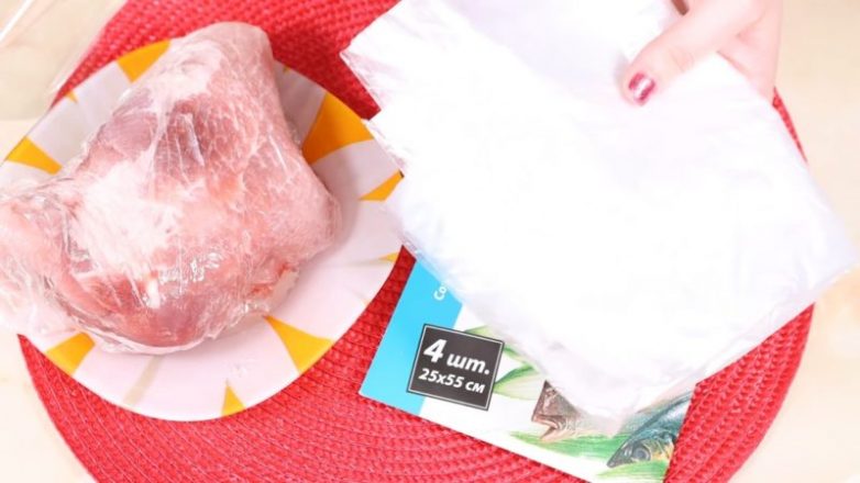 Замороженное мясо переложите в пакет, завяжите. Удобно использовать пакеты для запекания.