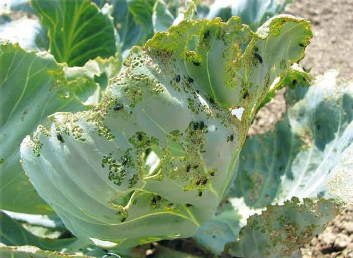 Крестоцветных блошек легко заметить по изрешеченными мелкими точками листьям капусты. Выглядят они как маленькие чёрные жучки.Капустная тля