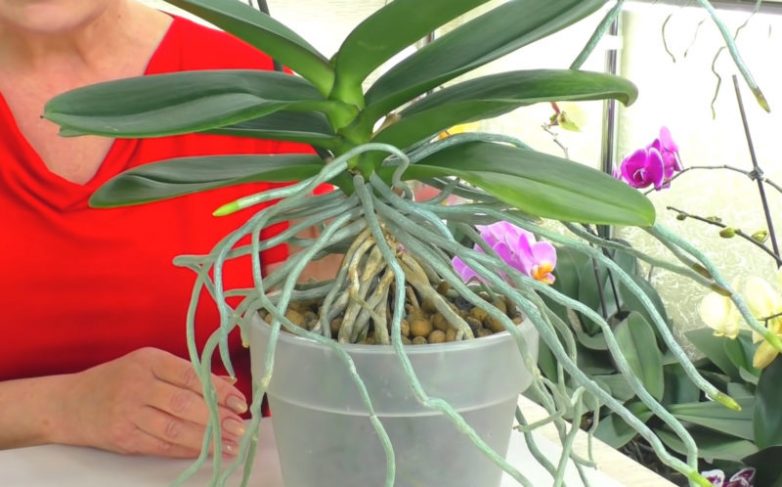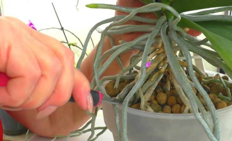 Также необходимо удалить все обрезанные корни, оставив только целые воздушные. Перед посадкой орхидеи в грунт следует на 30-40 минут поместить все воздушные корни в воду с температурой около 30 градусов. Делать это следует аккуратно, чтобы не навредить растению. Если корни сильно разрослись, используйте большое ведро.