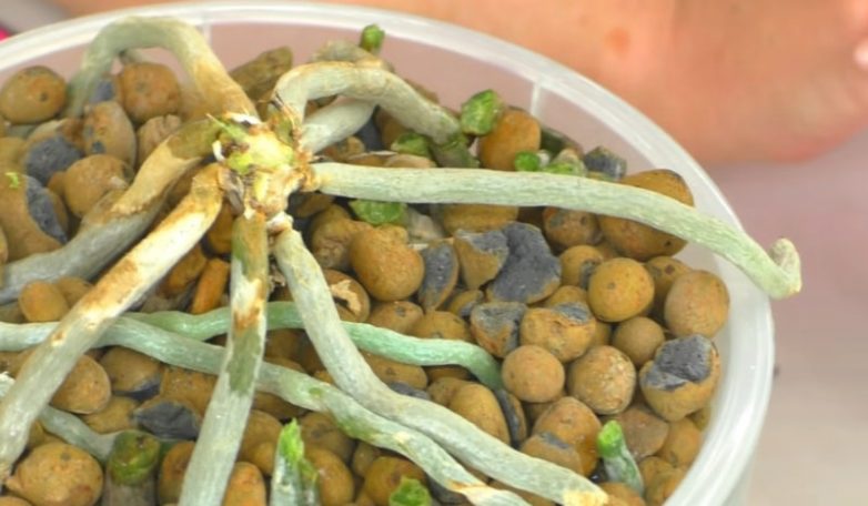 Дело в том, что сухие воздушные корни очень ломкие и при посадке в горшок их можно легко сломать, корни, напитанные водой, более податливые и разложить их в новом горшке будет гораздо проще. Аккуратно засыпьте горшок керамзитом. Следующий полив будет необходимо осуществить только после того, как все корни хорошо просохнут.