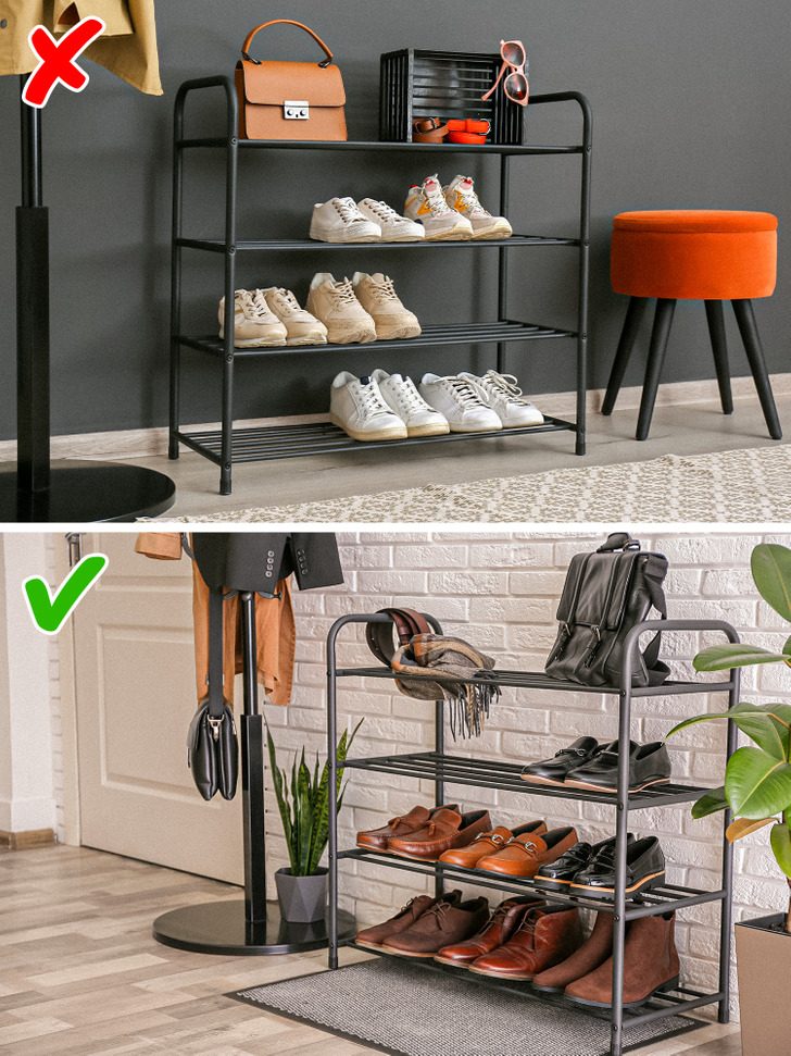 Лучший способ упростить себе процесс уборки — это заранее позаботиться о «ловушках» для грязи. В данном случае ее роль может сыграть поддон для обуви или хотя бы коврик, который следует разместить под обувным стеллажом. Они предотвратят как очевидные загрязнения в виде стекающей слякоти в зимний и осенний периоды, так и незаметное распространение песка и пыли с подошвы по дому.