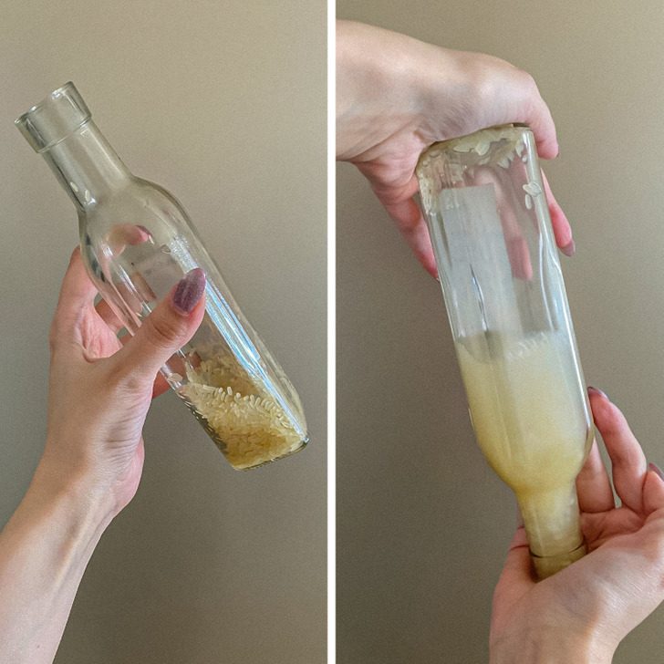 Отмыть изнутри бутылки с узким горлышком — тот еще квест: даже с помощью специальных узких щеток не всегда удается добиться нужного эффекта. Если вы как раз столкнулись с такой проблемой, попробуйте прибегнуть к хитрости с рисом.