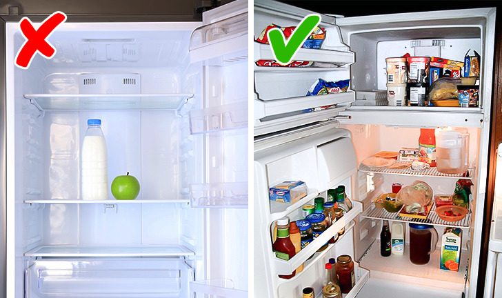 Умеренно наполнять холодильник, но не оставлять его пустым