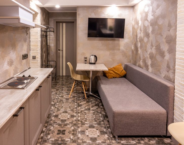 Диван в кухне — это единственная возможность жить в однокомнатной квартире бывшим супругам после развода, тут уже не до красоты, чтобы, как сказал Булгаков, квартирный вопрос их не испортил.