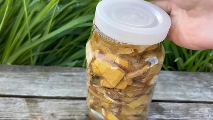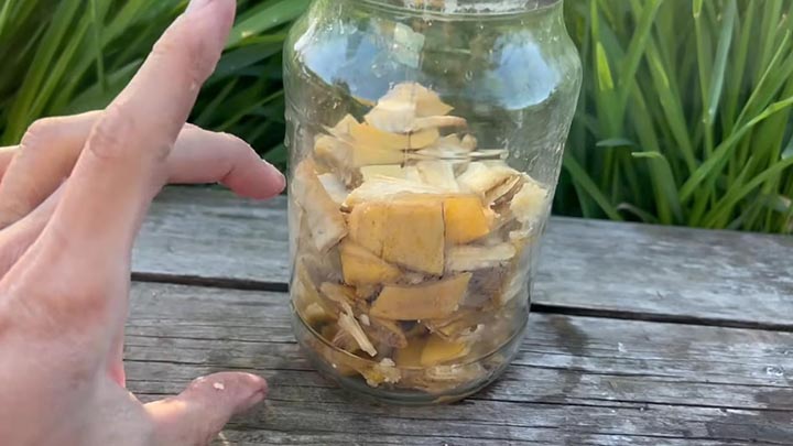 Литровую банку наполовину наполните банановой кожурой (порезанной). Залейте литром тёплой воды. Накройте крышкой, оставьте в тёмном месте на 3-4 дня. Когда в настое появятся пузыри, она готова.