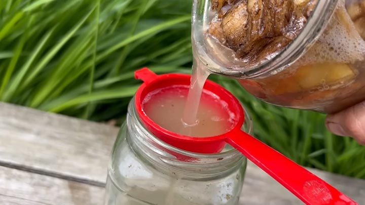 Процедите. У неё нет неприятного запаха — пахнет просто бананом. Она довольно густая, поэтому её нужно будет развести перед тем, как давать цветам.