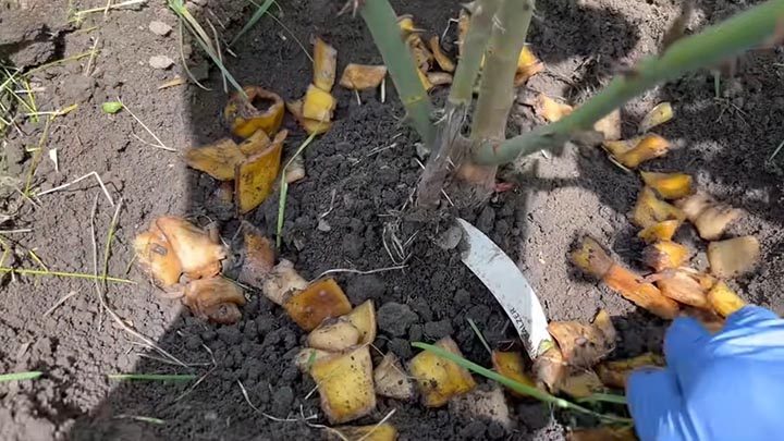 Банановую кожуру закопать вокруг садовых цветов: пионов, роз, хризантем и т. д. Она будет медленно разлагаться и питать цветы.