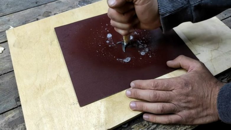 Затачивать ножи нужно на идеально ровной поверхности — тогда получится качественный результат. Для этого понадобится стекло или зеркало в качестве основы. Под него положите какую-нибудь деревянную поверхность. Сверху на стекло закрепите двусторонний скотч и к нему, на стекло, прилепите 600 наждачную бумагу.