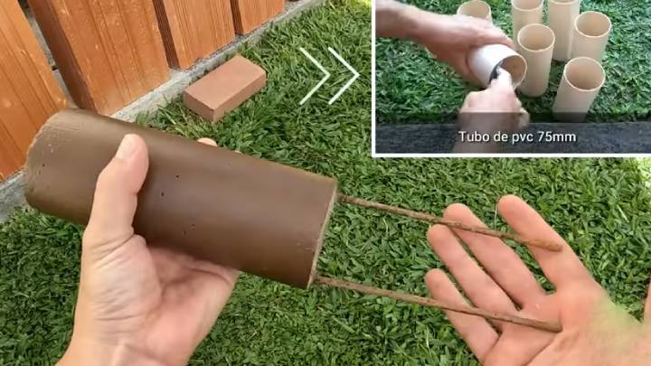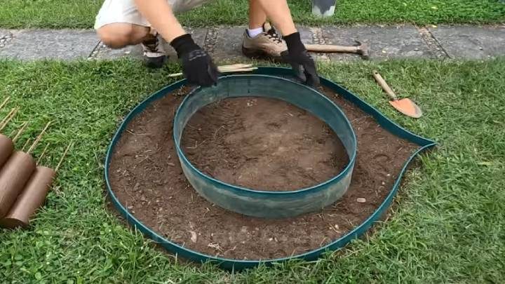 Для декора вокруг клумбы понадобятся детали из цемента. Для этого густой цементный раствор можно залить в туалетные втулки или в ПВХ-трубы, нарезанные на одинаковые детали. Внутрь вставить две железные арматуры. Затем выбрать место под клумбу. Выкопать землю с травой. Прикопать гибкую бордюрную ленту. Сделать её в форме капли. Внутри сделать круг из ленты.