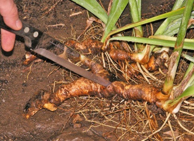 Этап 2 – собственно деление. Корневую массу разделите руками, выберите участки для обрезки – у нового растения должно быть не менее 3 стеблей. Отметьте точки роста и с помощью острого секатора или садовых ножниц отделите деленку. Повторите процедуру, если исходное растение очень крупное. Корни немного подрежьте, слегка подсушите и посыпьте толченым углем, чтобы не занести инфекцию.