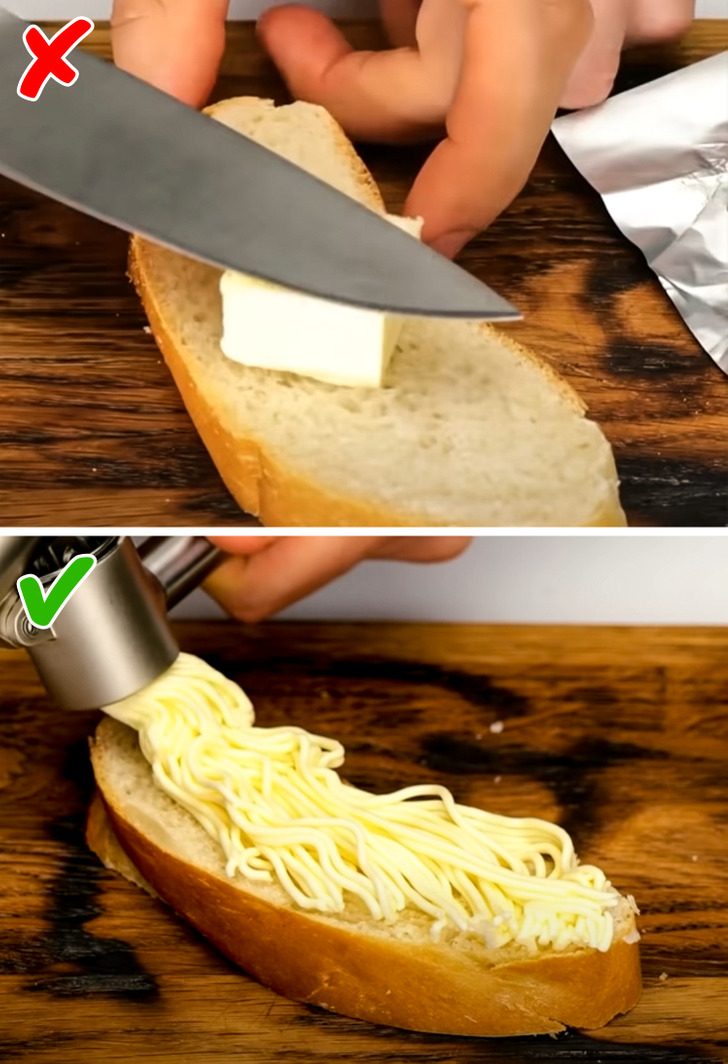Сделать бутерброд с подмороженным сливочным маслом довольно сложно, так как оно не ложится на хлеб, а если прикладывать усилия при размазывании, то он легко крошится. В следующий раз, когда вам срочно нужно будет намазать булку маслом, а времени на его аккуратную разморозку не будет, отрежьте кубик и прогоните его через пресс для чеснока.