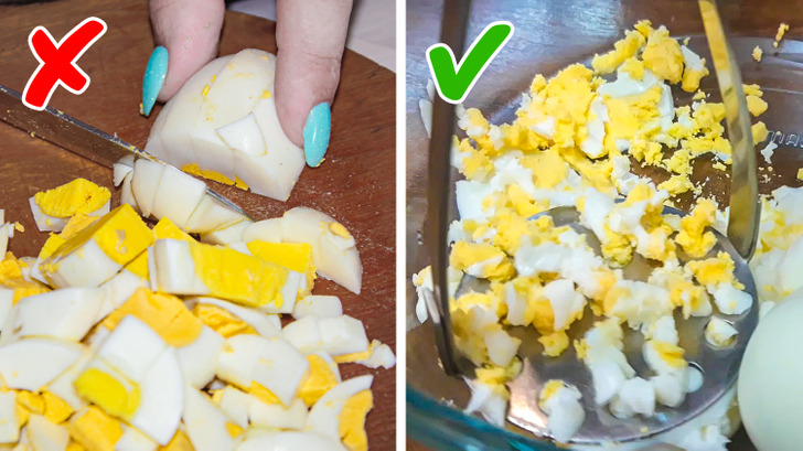 Если вам нужно измельчить большое количество вареных яиц, например для начинки пирога или для салата, не торопитесь по привычке браться за нож. Гораздо быстрее и проще это сделать при помощи толкушки для пюре: пара движений — и все готово. Главное, не перестараться, чтобы не получилась кашица.