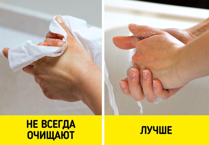 Антибактериальные салфетки действительно уничтожают микробы, но лишь на чистых руках. Если кожа покрыта грязью или жиром, содержащийся в салфетках спирт не сможет проникнуть через этот слой к коже. Обычное мытье рук в этом случае будет надежнее.