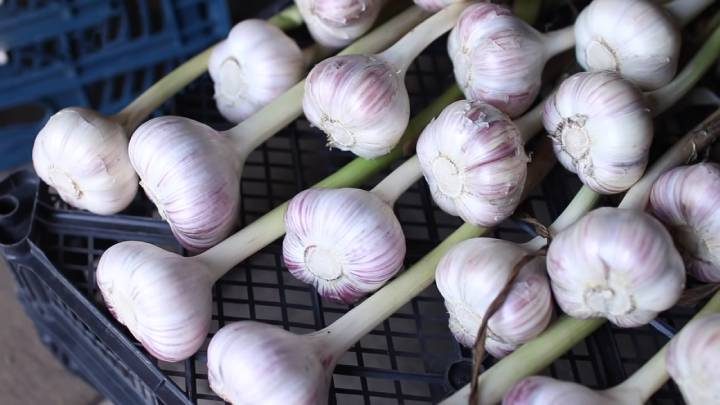 Прежде всего чеснок нужно вовремя убрать, чтобы головка не растрескалась. Для этого смотрите на стрелки чеснока: верхушка должна пожелтеть, а нижние листья — засохнуть. При этом дожидаться, когда полностью вся стрелка чеснока пожелтеет, не нужно — иначе чеснок растрескается, и луковица раскроется.