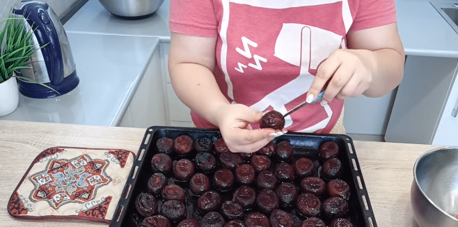 После чего вновь придавливаем сливы, со всех сторон обмакиваем из в сиропе и оставляем остывать до комфортной для рук температуры. На этом же этапе удаляем из плодов косточки, для этого делаем надрез с боку, через которой легко вынимаем косточку.