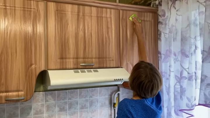 Чистящее средство следует равномерно распределить по кухонным гарнитурам губкой. Оно растворяет жирную плёнку и липкий налёт практически сразу! Его нужно оставить всего на 5-10 минут поконтактировать, после чего остатки смыть чистой тряпкой с водой. Это настолько легко и быстро, что даже не верится — однако, попробуйте почистить кухню таким образом, и вам наверняка понравится!