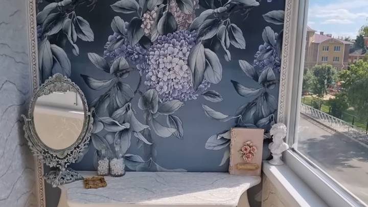 Завершающим штрихом стала акцентная стена, возле которой и стоит столик. На неё она приклеила красивую ткань с помощью клея для обоев. В любой момент ткань можно снять и поменять на другую — для этого её просто нужно намочить. Кстати, подоконник можно также задекорировать, особенно если он пожелтел со временем. Для этого на него можно просто приклеить самоклеяющуюся плёнку!