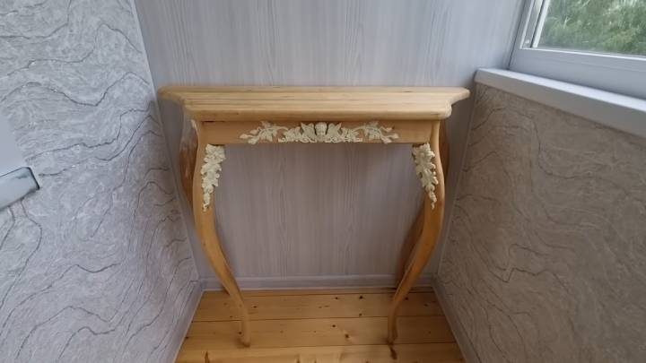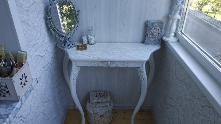 У неё также был в наличии старенький консольный столик. К нему она добавила самодельную лепнину из силиконовых молдов, загрунтовала. А места возле лепнины покрыла финишной шпатлёвкой, чтобы декоративные элементы смотрелись единым целым со столиком.