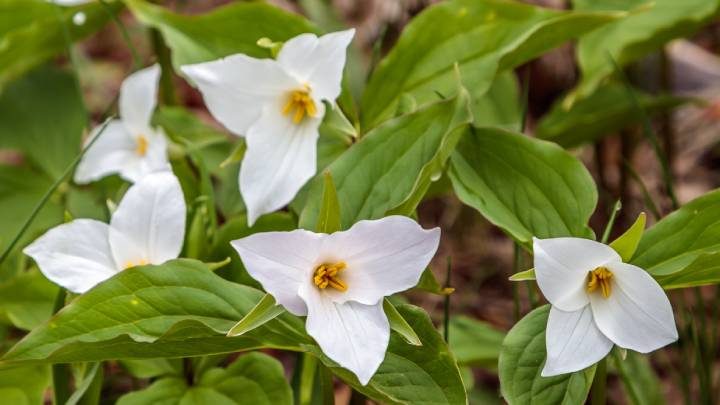 Ещё один чудесный многолетник для тени — белоснежный триллиум. Название произошло от необычной листвы — цветок растёт в центре трёх листьев. Есть разные сорта с необычной раскраской листьев и цветов.