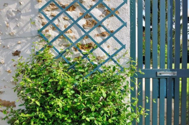 Помогите вьющимся растениям, соорудив для них садовые решетки. Расположить их можно на наружных стенах дома, позволив вьюнкам самостоятельно заняться вертикальным озеленением. Пройдет совсем немного времени, и у вас получится пышная зеленая живая стена.