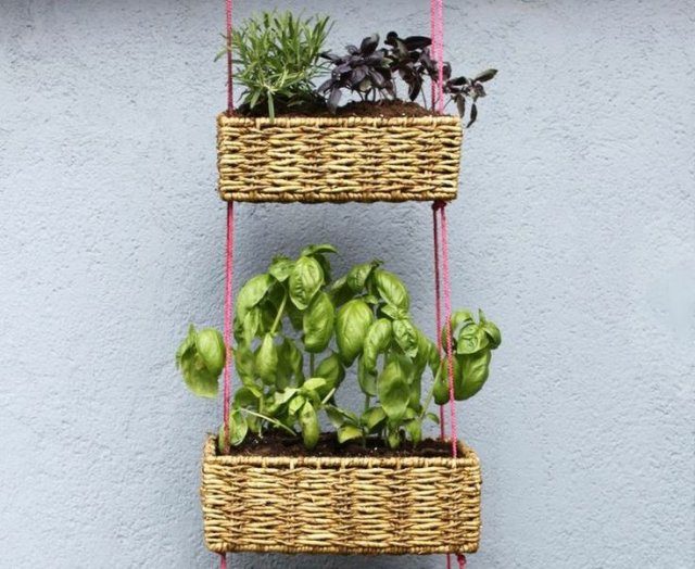 Еще одна идея для вертикального озеленения – подвесные «клумбы» из плетеных корзин.