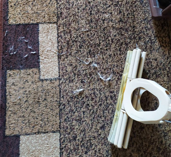Одна наша сотрудница рассказала, что обычная швабра для мытья пола с резиновой насадкой хорошо собирает шерсть с ковра, даже если кажется, что там ее уже нет. На фото выше — ковер, который только что хорошенько пропылесосили.