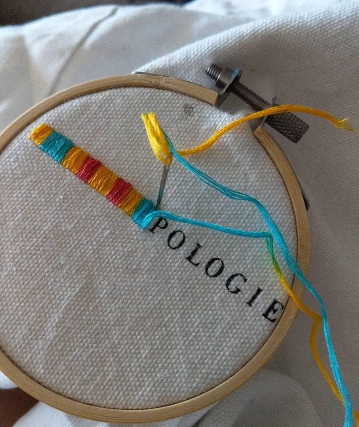 «Эта сумка досталась мне бесплатно, но я ненавижу логотипы, поэтому, вместо того чтобы выбросить, сделала поверх простую вышивку»
